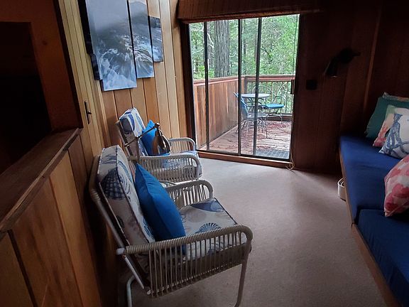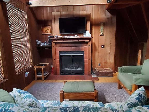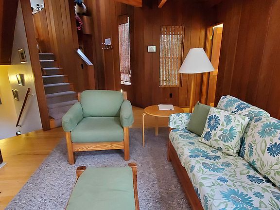 Two stories plus an upper loft and deck. Entry level is main living area with living room & kitchen, fireplace. Upstairs loft with a nice little balcony style deck in the lovely woodland. Downstairs bedrooms and bathroom. Outdoors in peaceful hillside woods, with hot tub and seating. Offered furnished. No cats. Renter is responsible for all utilities and services, except internet which is included in the rent. One year lease. No cats.
