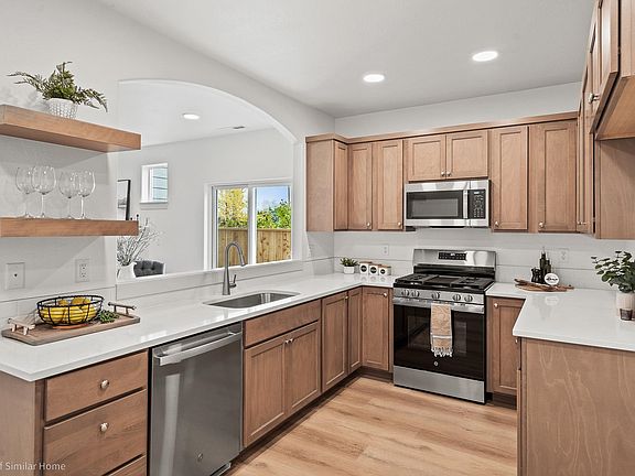 The Canyon makes every bit of its 1201 square feet count, offering great comfort in a modestly sized single level plan. The spacious living room adjoins the dining room, and the efficiently-planned kitchen boasts ample counter space and cupboard storage. An expansive main suite features a dual vanity bathroom and a generous closet. The other two sizeable bedrooms - one of which may be converted into an optional den - boast large closets and share the second bathroom. It’s no surprise this home is as popular as ever. This home comes with a fully finished backyard and in addition, full backyard landscaping.