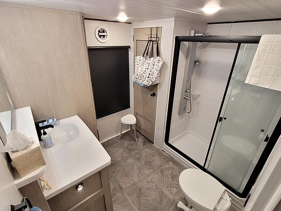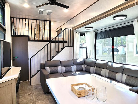 Dreaming of spending all summers on Cape Cod? Make it reality with this Like New Salem Grand Villa View destination trailer sold w/all contents in Old Chatham Park (seasonal, NO YEAR-ROUND). Comfort of home: Tall ceilings, 3 sleep areas that sleep 9: 1 BR+2lofts,+ pullout sofa. 2-zone Central A/C, central vac., washer/dryer, kitchen w/island, full size refrigerator, gas range. 2 Fireplaces, retractable TV, USB outlets, Great outdoor set-up with yard &stone (no mowing), outdoor furniture, picnic table,shed, outdoor shower. Park has Pool, basketball, volleyball, bocce, playground & Game room. 2025 fees $7956. Fees include lease of land, sewer, water, taxes, daily trash pick-up &amenities. Pets allowed. See Rules & Reg's in mls documents. Cash sale by bill of sale. Buyers must get park approval (background check). NO RENTALS ALLOWED. Owners responsible for site landscaping, cleaning, unit winterizing, electric, cable/internet, propane & insurance.