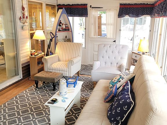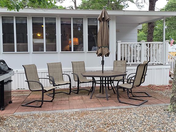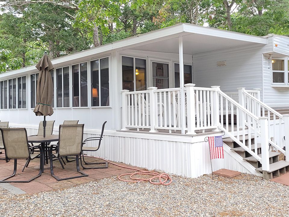 Immaculate move-in 2BR Cape Cod summer home in Dennis for $120K! 2003 Breckenridge Park Home in Old Chatham seasonal resort (open May 1st to Oct.31st No rentals allowed in the park.). Very bright & open, it features central heat & A/C, a sunroom with fireplace and 2 big bedrooms (Queen bed in 1st, Queen bed and 2 bunk beds in 2nd) . Being sold furnished & turn-key with all contents, so just move in! Also offers a front porch, an outdoor shower & a patio. Park amenities include a beautiful pool, new playground, basketball, Volleyball & bocci courts, clubhouse/ game room & picnic area. Annual fees are $6456 for for 2023 season of which a $600 deposit is included in the price. Buyer to assume balance due before May 1st 2023. Fees incl. lease of land,sewer, water, taxes, daily trash pick-up, amenities & on site management. Pets are allowed with some restrictions. No financing available for seasonal park, cash sale only by bill of sale. All buyers must get all park approvals (credit check, background check) prior to closing.Firepit is excluded from the sale. Rules attached in mls documents. Wooden shed cannot stay.