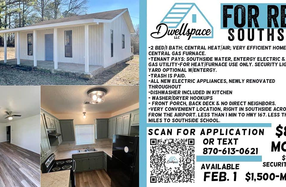 2 BED 1 BATH NEWLY RENOVATED HOME IN SOUTHSIDE SCHOOL DISTRICT $800/month, $700/security deposit= $1,500 move in. 1 Year Lease. Available ~Feb 1, 2023. -Central Heat/Air, very efficient. Home has central gas furnace- natural gas utility is only used for heat in the home. -Tenant pays: Southside water, Entergy Electric, Summit gas utility (electric/gas bills level out in cold months, due to furnace use). Trash is PAID. -All new electric appliances, plumbing fixtures. -dishwasher included in kitchen - washer/dryer hookups - Front/back porch No direct neighbors. -Very convenient location, right in Southside across from the airport. Less than 1 min to Hwy 167. Less than 3 miles to Southside school. - Rent payment options include: secure online-credit boosting option! (free bank transfer or debit/credit options for small fee), local bank deposit or cash. Free application process- Contact via phone or email for link. Applications are easily filled out on smartphone or computer. Applications are collected, vetted and reviewed thoroughly; upon selection, you will be contacted if approved for a showing of the home. No need to contact to see if application received- submission is confirmed upon completion online. After a house showing, with approved applicant, lease agreement can be signed by both parties. Application/showing in no way constitutes rental agreement, these decisions are made after application process complete. 2 BED 1 BATH NEWLY RENOVATED HOME IN SOUTHSIDE SCHOOL DISTRICT $800/month, $700/security deposit= $1,500 move in. 1 Year Lease. Available ~Feb 1, 2023. -Central Heat/Air, very efficient. Home has central gas furnace- natural gas utility is only used for heat in the home. -Tenant pays: Southside water, Entergy Electric, Summit gas utility (electric/gas bills level out in cold months, due to furnace use). Trash is PAID by landlord. - Rent payment options include: secure online-credit boosting option! (free bank transfer or debit/credit options for small fee), local bank deposit or cash. PETS: Case by case basis with approved application- Message for details.