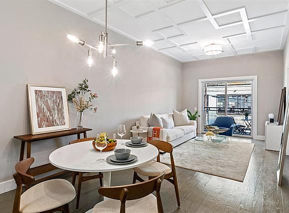 Coffered ceilingsCentral airReal hardwood floorsFloor-to-ceiling tiled luxurious bathsIn-unit laundryStainless steel appliancesQuartz countertops