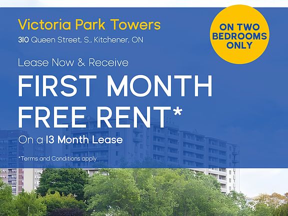 Welcome to Victoria Park Towers, where urban convenience meets natural beauty. Our spacious 1, 2, & 3-bedroom apartments offer everything you need for modern living, all within walking distance of downtown Kitchener's best attractions!