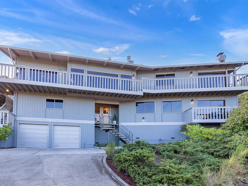 A rare combination of a close-in location and absolutely breathtaking, unobstructed Bay views. The property was designed to take full advantage of the views with expansive windows, view-facing entertaining spaces, and a fabulous deck that completely wraps around the home. On the main level, the open-concept living and dining rooms sit beneath soaring vaulted ceilings and enjoy an entire wall of windows and inset glass doors to the deck. At the back of the home, the kitchen offers crisp painted wood cabinetry, a large casual dining room, outdoor access, and a convenient pass through bar to the expansive deck. Privately located in a separate wing, a spacious bedroom has a picture window, and the primary suite offers private balcony access and a generous walk-in closet. On the lower level, two additional bedrooms and a fabulous fireside family room have access to a full bath. The perfect venue to relax and entertain, with an incredible vantage point overlooking all of Silicon Valley!