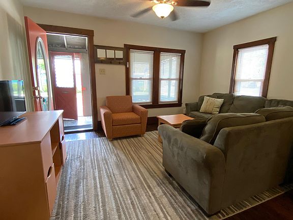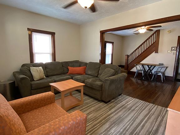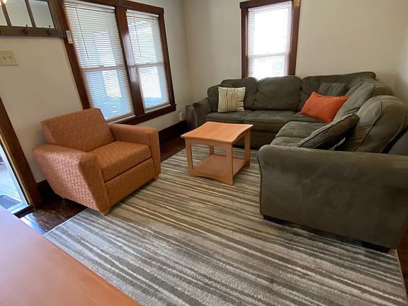 No parking permits are required in this 2-bedroom, one-bath apartment overlooks Rose Street on-campus housing. The enclosed porch is a great option for chilling at the end of the day. The living room has comfortable seating, and a media stand with a TV. The dark-stained floors and woodwork are throughout the unit. The furnishings ' light wood and stainless accents perfectly contrast the mahogany trim. A lit cabinet is great for those items that never seem to have a place or can't be displayed. Watch TV from the dining table that seats two or open those books. The galley-style kitchen has linoleum flooring, pantry storage, stove/oven, refrigerator, microwave, and dishwasher. The residents will enjoy free laundry in your private basement. Easy walking distance so save your gas. SUMMER LEASING AVAILABLE