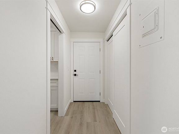 Fully updated! All new Flooring, paint, cabinets, appliances, light fixtures, solid core doors, trim, hardware, baseboards, Corian counters, window treatments and water heater. This 2 bed 2 bath 2nd floor unit is a must see. Kitchen has all stainless steel appliances, with soft close cabinets and Corian countertops. Living area has a real wood burning fireplace with white washed brick surround and black granite hearth. Slider door in living room leads out to your large deck with view of court yard and access to your private storage area. There is also more storage downstairs and laundry room. Nice sized Master bedroom has private En Suite. All privately owned, no rentals. Amazing location close I-5, hospital, park, shopping and restaurants.