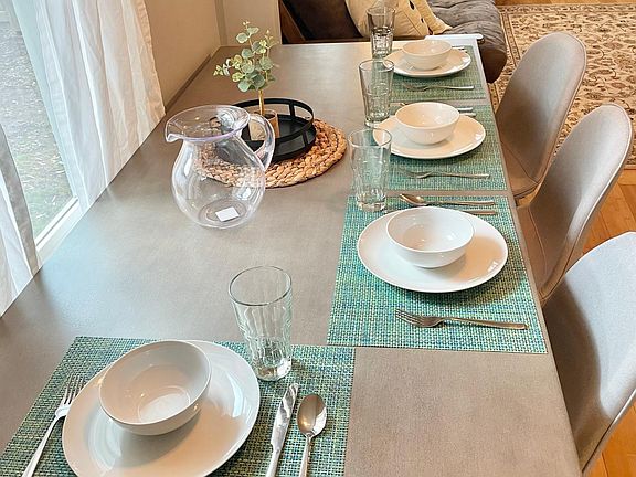 The cute kitchen is supplied nicely with plenty of cookware and dishes to whip up those special meals shared with your family. Included is a gas-range cooking top, traditional coffee maker, and toaster. A comfortable dining area with a crafted wooden table, seats 6 people comfortably.