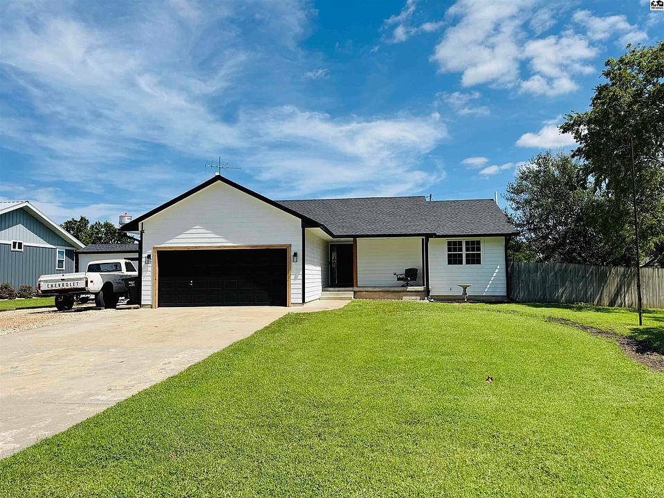 Well-Maintained Home on Corner Lot in Burrton. This spacious home sits on a large corner lot and offers a functional layout with great features throughout. The main floor includes 2 bedrooms, including a large primary suite with a private bath featuring a walk-in shower and soaking tub. You'll also find vaulted ceilings, a well-equipped kitchen with eating bar and included appliances, dining area, main-floor laundry/mudroom, and a recently updated hall bath with new tile flooring. The basement adds even more living space with a family room, fireplace, dry bar, two additional bedrooms with egress windows, a third full bath, and plenty of storage. Vinyl windows throughout PLUS new LP Smart Siding, and new Class 4 shingle roof. The home also features a 2-car attached garage, extra off-street parking, and additional storage building. Recent paint and updates make this house move-in ready!