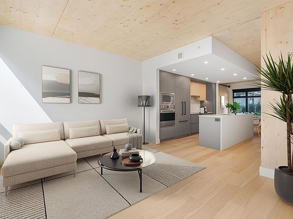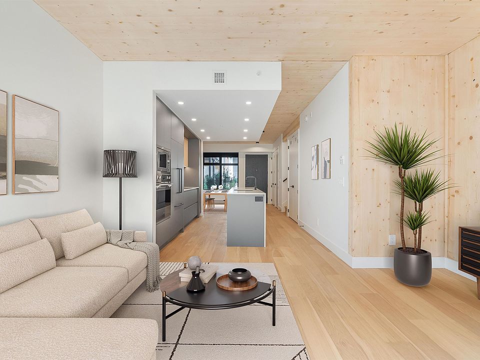 Corner homeModern high-design interiorsExposed clt panelsWide-plank oak floorsSleek kitchenQuartz countersSpa-inspired baths
