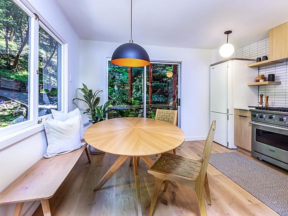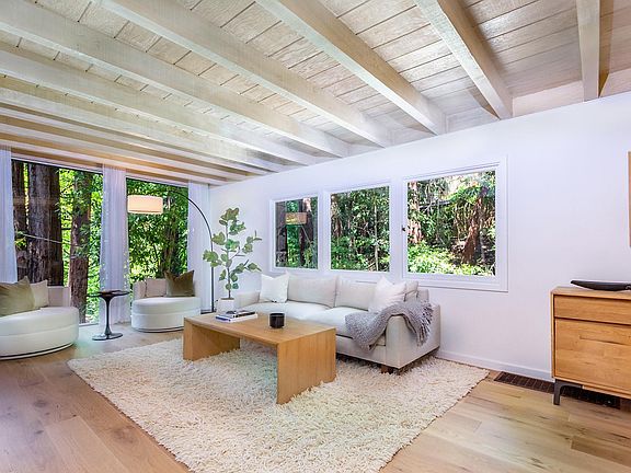 Amongst the redwoods, in a quiet neighborhood is a thoughtfully designed mid century modern & stylish property with new finishes. The home has been recently improved with furnishings and wide plank oak hardwood flooring. New kitchen with Viking range, Smeg refrigerator, Viking dishwasher, custom cabinets, solid wood shelves, and custom lighting. Beautiful fireplace with handcrafted tiling. Floor to ceiling windows look out to the redwoods forest. Two outdoor seating areas, one at entry & another on a sunny upper deck with comfortable seating. 2 bedrooms newly furnished. 1 bathroom with high end finishes featuring Heath tile & a large window to the forest. Walking distance, within a mile, to Mill Valley's town square. A short walk to Blithedale Park and its vast trail systems.