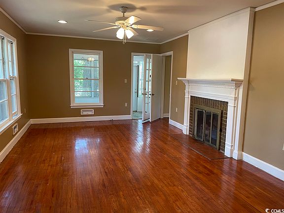 Charming 3 bedroom house on Marion Street near downtown Kingstree. The house sits on a large lot and is shaded by mature trees. The house has original hardwood floors and tons of architectural charm like picture moulding, baseboards, and a fireplace/mantle in the living room. In addition to the indoor living space, there are two porches: a screen porch connecting the garage and kitchen, and a sun room off the living room.