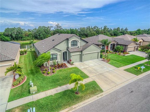 This stunning 4/3/3 home is located in the gorgeous community of Harbour Isles! The lush green lawn, tropical landscaping & wrought iron glass entry door beckon you inside. Step into the foyer & find the formal dining room with chandelier, tray ceiling & stately columns. A comfortable bedroom & full bathroom make the perfect guest suite! Continue to the beautiful well-equipped kitchen with cherry cabinets, granite counters, center island, breakfast bar, stainless appliances, wine fridge & more! "Hidden" stairs lead from the kitchen to the over-sized bonus room with ceiling fan, carpet, storage closet & window seat. Just off the kitchen is the utility room, complete with mud sink & storage shelves. The extensive great room has easy-care ceramic tile & sliders to the screened lanai. Two large secondary bedrooms have ceiling fans & plush carpeting, adjacent to the full bathroom with convenient access to the lanai! The master suite boasts 2 walk-in closets, his & her vanities, garden tub, large tiled shower & separate water closet. The huge backyard features an iron fence that offers a lovely view of the pond & conservation area (no rear neighbors). Community features fitness center, swimming pool, fishing dock, walking & biking trails, basketball & volleyball courts, boat & RV storage area, playground, covered pavilion & picnic areas. Enjoy dining at one of the many waterfront restaurants nearby, only minutes to the beach! Short commute to I-75 for access to Tampa, Sarasota, St. Pete.