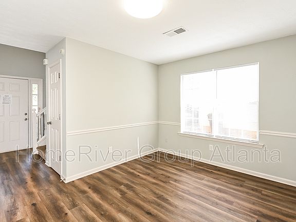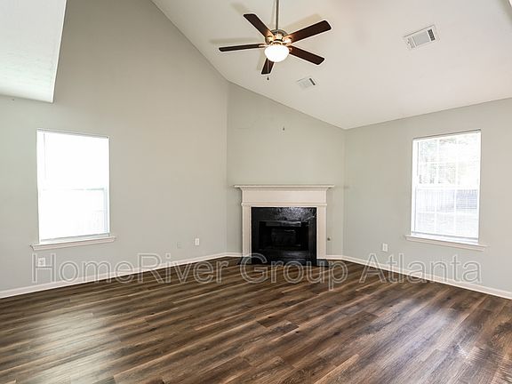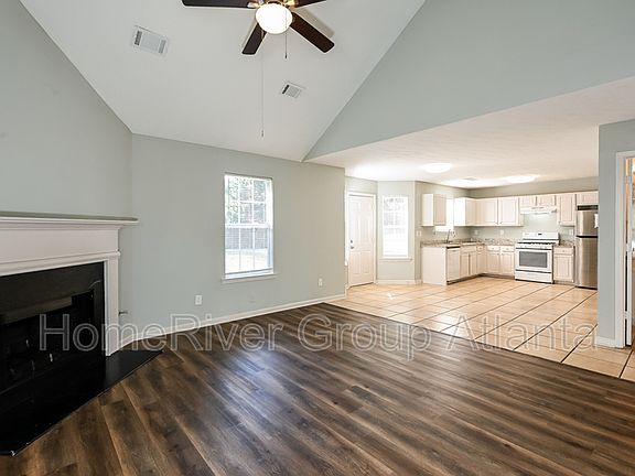 This 4BR/2.5BA 2227 sqft home has a fenced backyard. The home opens to a foyer with stairs nearby for you to dash upstairs to get settled and changed in the generous-sized main bedroom with tray ceilings, an en suite, a walk-in closet, a separate shower and tub, or one of the two secondary bedrooms with cathedral ceilings, in the shared hall bath, and in the 4th bedroom that is perfect for an office or guest. Once back on the main, a separate dining room greets you and your guest, and it's situated in an excellent location for entertaining and having family dinners. The great room is spacious and has roaring high ceilings, a fireplace, and a view of the eat-in kitchen with white cabinets, gas range, refrigerator, dishwasher, walk-in pantry, laundry room, a conveniently located half bath, and access to a patio and fenced in backyard. The fresh paint, laminate, and ceramic tile flooring provide a house you will proudly call home. The home is conveniently located near Hwy 42 and Eagles Landing Parkway.