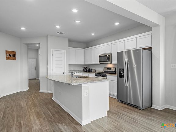 Step inside to discover luxury vinyl plank flooring flowing through the main living areas, complemented by expansive windows that fill the home with natural light. The spacious living area showcases views of the backyard and seamlessly connects to the kitchen. Here you’ll enjoy granite countertops, an island with bar seating, white cabinetry with pullout drawers, stainless steel appliances, and a pantry—the perfect blend of style and function.
