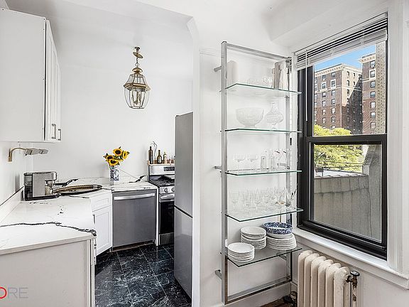 The primary bedroom, with both north and east exposures, is oversized and easily accommodates a king-size bed. The second bedroom is equally well-proportioned with ample storage. High ceilings, prewar details, and a flexible footprint make this residence an excellent opportunity to create a customized home.