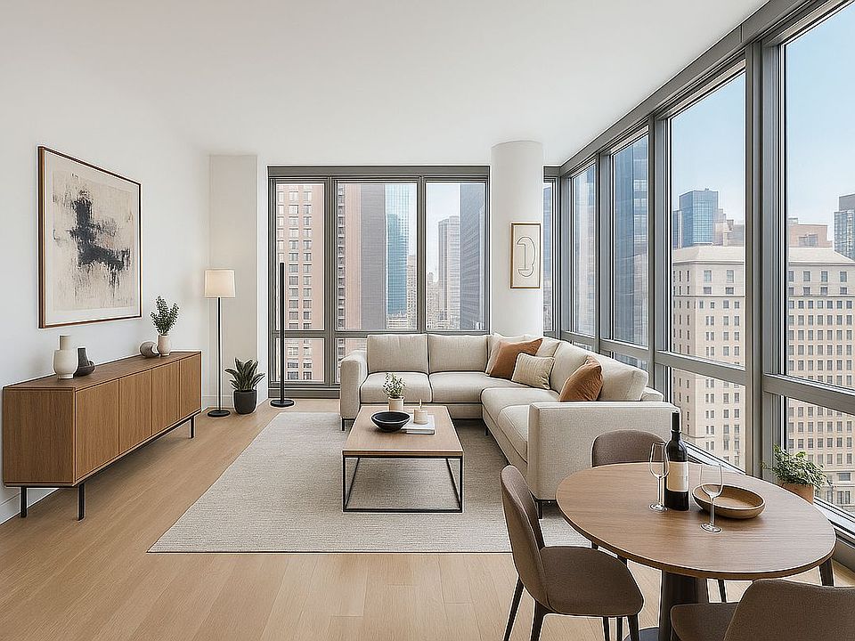 Welcome to Residence 17A at 310 West 52nd Street—one of the most coveted lines in the building and a rare chance to own a sun-drenched, corner 1-bedroom, 1.5-bath luxury condo with panoramic skyline views to the east, south, and north. Spanning nearly 800 sq. ft. and wrapped in 15 floor-to-ceiling, double-paned windows, this home delivers dazzling natural light all day long—while keeping city noise out for total peace and quiet.