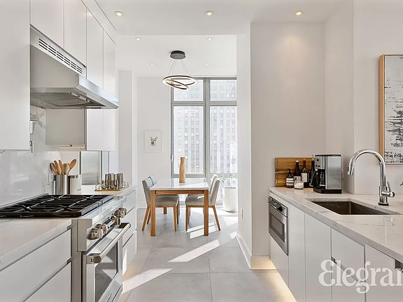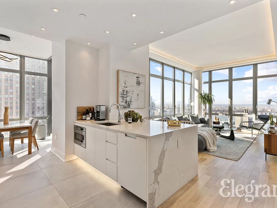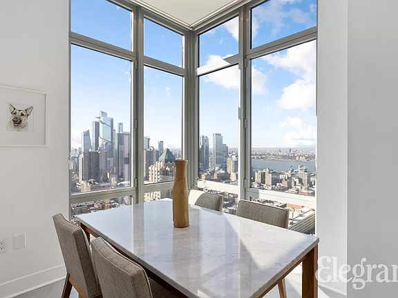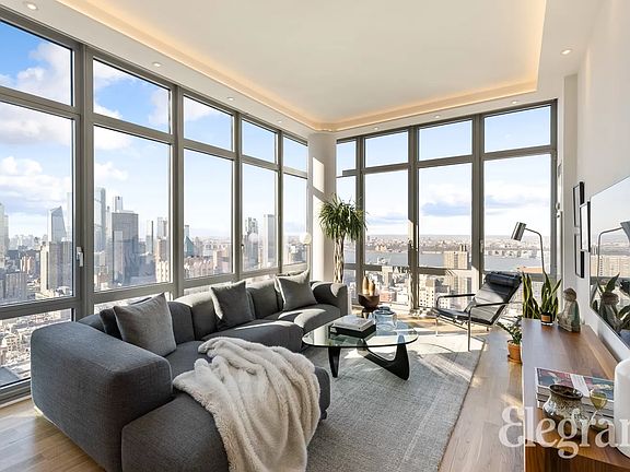 WELCOME to this ultra deluxe, totally private, and one-of-a-kind Manhattan home. A generous layout offers an abundant amount of space in just about every room in this beautifully renovated apartment. 11 foot ceilings and massive floor-to-ceiling windows gracefully showcase the unparalleled million dollar views that each room reveals. With triple exposures, owners can enjoy city views, rivers views, and spectacular sunsets above the Hudson. A fully loaded kitchen awaits, showcasing an extra large kitchen island and bench, concrete heated floors, a Wolf range, built-in microwave, subzero refrigerator, and Miele dishwasher. Entertain your guests or relax in a spacious living room that has unobstructed views of Hudson Yards and the Hudson River. Custom sheers, ceiling as well as accent lighting give this home an added luxurious touch. Wide plank hardwood floors have been tastefully restored in a rich walnut satin finish and offer a sophisticated warmth to the apartment. Find haven in a California king-sized master suite that offers a walk-in closet, generous additional closet space, and a customized ensuite with heated floors and extra-large walk-in shower that features rain shower head, a hand held, and power jets. The second bedroom offers equally exquisite details including its own ensuite bathroom with deep soaking tub, radiant floors, and custom cabinets. The guest powder room features a customized sink and counter alongside custom wood wall trim. Bosch Washer & Dryer. The entire apartment sits above every residential roofline nearby and offers its residents complete privacy. This is a full service, 24 hour doorman & concierge building located in a prime location. Flanked by Columbus Circle, The Theater district, and Times square, it's no wonder why time after time, people purposely choose to live here. Enter through a modern glass cube that opens into a spectacular lobby that features potted Japanese maples. The building has two beautifully landscaped terraces and a full sized gym with free weights, peloton bike, and cardio machines. Storage bin comes with the apartment! There is a garage right downstairs and around the corner for added convenience.