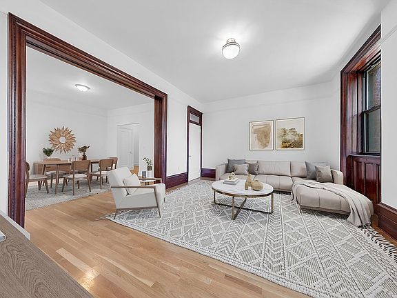 The spacious living room is graced with high ceilings, beautiful classic wood moldings and trim, and large windows that invite warm natural light throughout the day. A separate dining area makes entertaining and everyday living equally comfortable. The primary bedroom boasts generous proportions and serene light, with excellent closet space throughout the home to keep things effortlessly organized. The two additional bedrooms provide smart flexibility for a home office, nursery, guest room, or creative space. The windowed kitchen with sleek GE Profile stainless-steel appliances, generous counter space, and an in-unit washer/dryer adds modern convenience to this timeless residence. Additional storage needs? Two spacious storage units are also included, providing the extra room every New Yorker needs. Enjoy the benefit of low monthly carrying costs, enhancing the home's value and affordability!