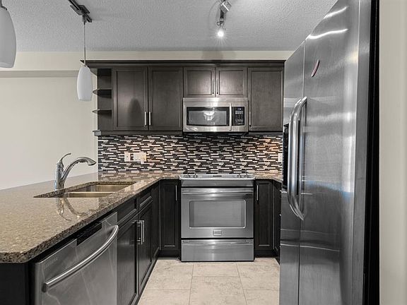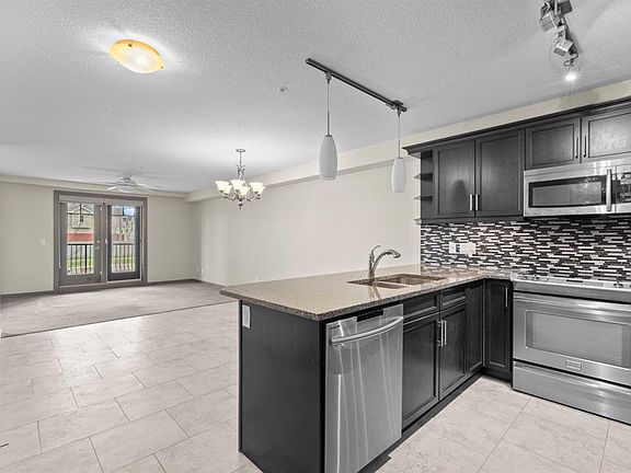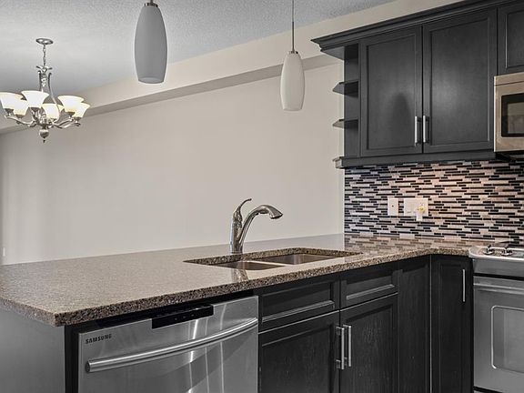 A Great Investment Property or place to call home! This Spacious Condo has an open concept floorpan with a Stylish Upgraded Kitchen over looking the huge Dinning/Living room area which is a great space to entertain Friends and Family. The Kitchen features Granite countertops, dark cabinetry with glass mosaic tile backsplash, under counter lighting, breakfast bar & upgraded stainless steel appliance package. The large open Living/Dining room area has French Patio doors to a large balcony with gas hook-up. The den is a the bright area off the Living room with a big window that makes a great office space. The Primary Bedroom features a walk-through closet and adjoins to a 3 pc bathroom. Convenient in-suite laundry and pantry. Custom window coverings including blackout blinds. Heated underground secure parking stall and a secure storage locker. Complex has Bike Storage available as well. McKenzie Towne is a great place to call home and is close to the South Campus Hospital, Shopping, Restaurants, Bike paths. 18+ Building. This freshly painted condo is ready to move in!