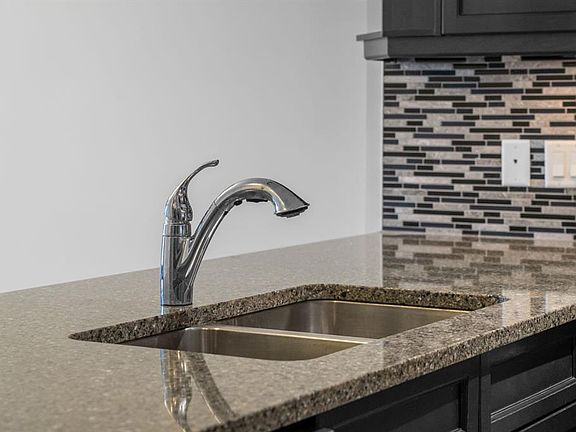 Stylish upgraded kitchenGranite countertopsDark cabinetryGlass mosaic tile backsplashUnder counter lightingBreakfast barFrench patio doors