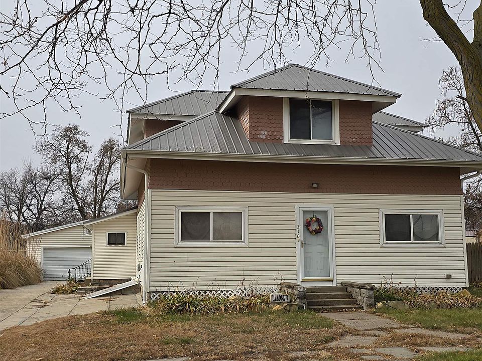 This spacious 2-story home offers a stunning combination of classic charm and modern convenience, highlighted by gorgeous woodwork throughout and a large eat-in kitchen. With a huge eat in kitchen, this well-kept home has vaulted ceilings in the kitchen area great for entertaining large groups, tons of countertop space and cabinet space! The spacious kitchen walks onto the large back deck and backyard! With a main-floor master suite with a full bath just off the bedroom, additional main floor full bathroom and three additional bedrooms upstairs, this home is perfect for families or entertaining. The large deck off the kitchen provides a great space for outdoor living, and the detached 2-car garage offers ample storage. This home is in very good condition and has been well kept throughout. Sits in a quiet neighborhood close to school, downtown and swimming pool! Features large detached 2 car garage and alley access for additional garage door opening off the back. Features newer windows, nice metal siding and metal roof! Come make this move in ready home yours today!