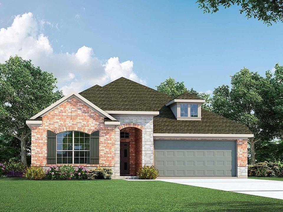 The oversized 2-car garage includes a 5' extension on the side for extra storage or workspace and a Texas basement for additional storage.