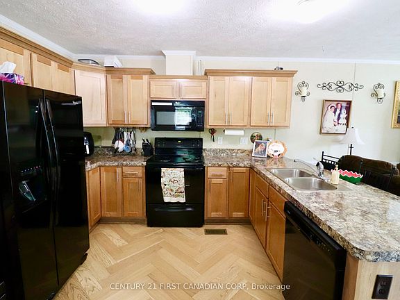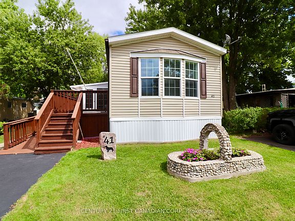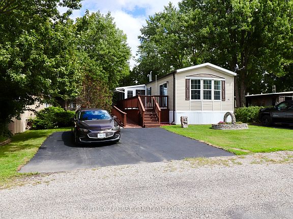 Welcome to this charming 9-year-old mobile home in the highly desirable 55+ community of Anthony's Mobile Park, just 15 minutes from London. Set on a beautifully landscaped lot, this home greets you with a cozy front porch and a bright sunroom, the perfect spot to enjoy your morning coffee or relax in the evening. Inside, the kitchen features warm wood cabinetry, a breakfast bar, and flows into the bright and comfortable living area. Herringbone hardwood floors add style and durability to the kitchen and living room. With 2 bedrooms, a 4-piece bathroom, in-unit laundry, and 896 swft of thoughtfully designed living space, this home is both functional and inviting. Practical features include forced air heating and central air, a water softener, owned water heater, 100 amp panel, and a ramp for easy access. Outside, you'll find a handy shed for extra storage. The monthly lease of $868.96 covers garbage, recycling, lot rent, property taxes, water, and sewage testing, making this home as affordable as it is comfortable. Move-in ready and nestled in a quiet, friendly community, this home offers easy living at its very best.