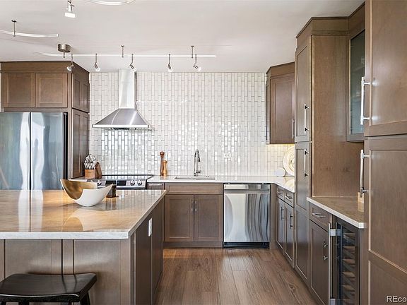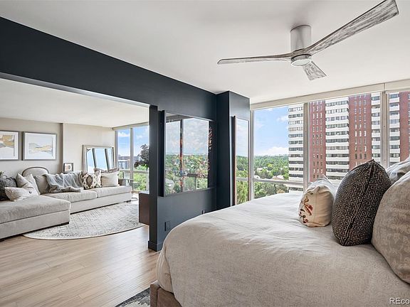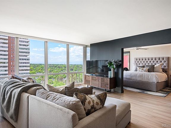 Elevated Urban Living in the Iconic Cherry Creek Tower! Welcome to Unit #1403, a beautifully updated residence on the 14th floor offering sweeping mountain and city views, just steps from the vibrant center of Cherry Creek. Thoughtfully renovated with over $150K in improvements, this home blends modern design with quality craftsmanship. Inside, floor-to-ceiling windows fill the open living space with natural light and frame stunning views from nearly every room. The kitchen features quartz countertops, custom Waypoint cabinetry, and high-end appliances—designed with both everyday living and entertaining in mind. It opens to a comfortable family room, ideal for gathering with guests or enjoying a quiet evening and a colorful Colorado sunset. The primary suite provides a peaceful retreat with tasteful finishes, incredible views, and a spa-inspired bath that includes a spacious walk-in shower, quartz vanity, and a custom walk-in closet for effortless organization. Rare in-unit washer and dryer hookup. Deeded parking spot and storage unit! Residents of Cherry Creek Tower enjoy recently updated amenities including a remodeled lobby, welcoming communal spaces, a fitness center, and a landscaped terrace with a water feature, BBQ grills, and updated pool area. New in 2024: electric car charging stations and a smartphone-enabled security system with guest access. Just outside your door, explore Denver’s premier shopping, dining, and cultural experiences. This home offers a rare combination of comfort, convenience, and vibrant city living.
