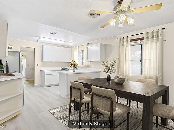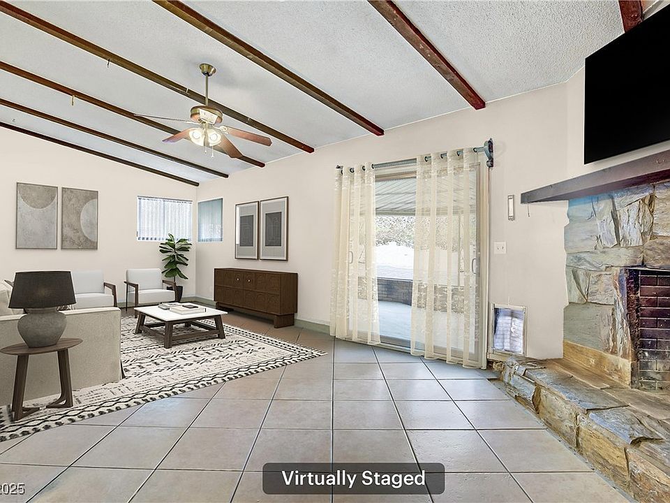 RARE single-story home with a circular driveway, county-zoned on nearly ½ acre in Las Vegas — with no HOA and endless possibilities. This home has solid bones with real wood beams, freshly painted, vaulted ceilings, & a cozy wood-burning fireplace that adds character and warmth. The updated kitchen includes quartz counters and a breakfast bar. Outside, enjoy mature shade trees, 2 storage sheds, a tree house, and a covered patio perfect for outdoor living. Ideal for a hobby farm or business owner needing room to store vehicles or equipment, this property is zoned urban for up to 2 horses & includes chickens (if you want), greenhouse, & raised garden beds for fresh produce and eggs. With potential for RV parking, space for a pool or guest house, solar panels for energy savings. This home offers wide-open space and sweat equity opportunity. Need storage? Come and bring your vision, properties like this don't hit the market often! 15 min to strip & priced to sell. Virtually staged photos.