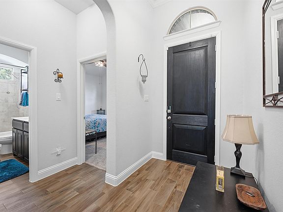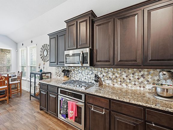 Absolutely the BEST lot in the neighborhood! 2019 DR Horton build. 4 bedrooms and 2 full baths. Open floor plan with large kitchen island, tons of cabinetry, large walk in pantry, built in wine bar or mini office off kitchen, stainless appliances and dark wood cabinets. Beautifully maintained home with wood like tile throughout the living areas. Split floor plan with private primary suite, separate tub and shower, dual sinks and large walk in closet. Granite and solid surfaces in kitchen and baths. Home is situated on the last lot in the neighborhood with no neighbors to the north, the west or in the east, in front of you. Street is a cul de sac so ample parking, room to play outside and little to no traffic. Walking distance to neighborhood pond, walking trail and pool. Frontier Fiber high-speed internet is being installed this month in the neighborhood! Good news for those of you that love to stream movies, are gamers or just work from home.