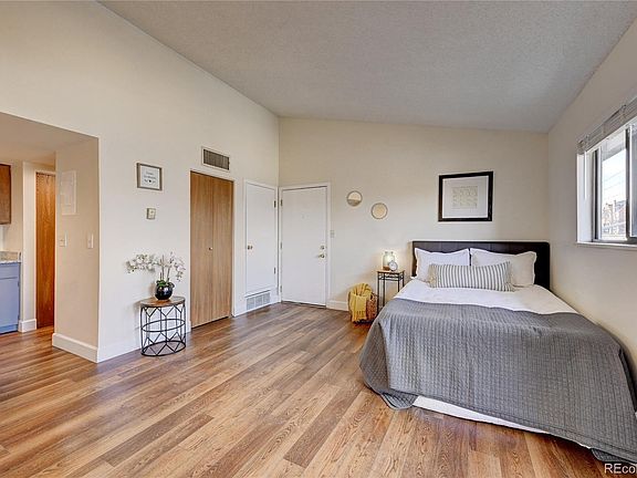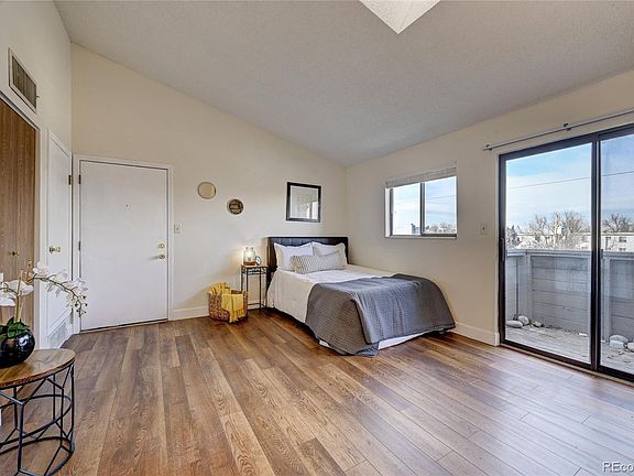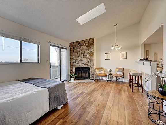 Enjoy spectacular views of the Denver skyline and the mountains from your private balcony with storage. Beautiful new quality flooring and trim, granite countertops, stove, dishwasher, paint, blinds, plumbing fixtures, lighting, and bathroom vanity were installed in 2024. The unit includes a refrigerator, washer, dryer, wood-burning fireplace, vaulted ceilings, skylight, a large pantry, and a reserved deeded parking spot. The complex also offers a pool, landscaped grounds, outdoor sitting areas, visitor parking, and convenient bus transportation a few steps away. Very few properties at this price point have forced heat and A/C. Don't miss it!