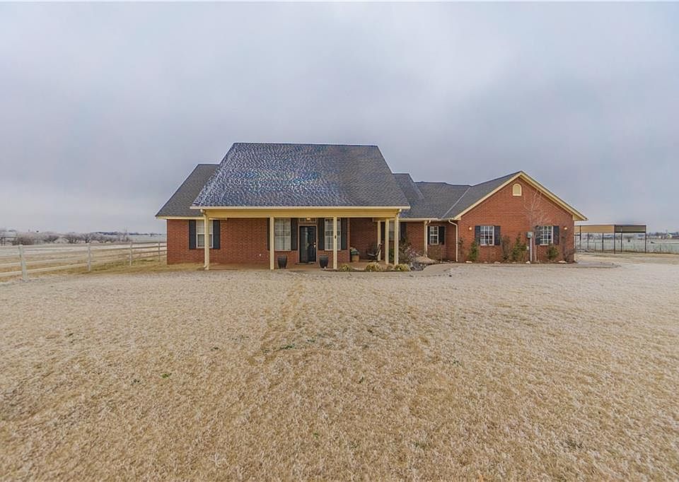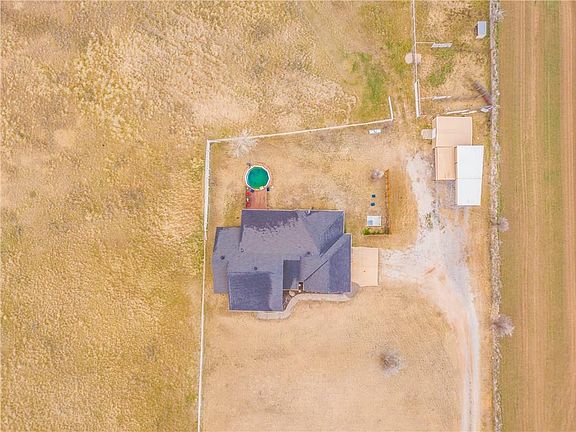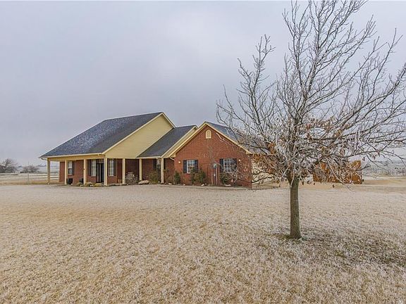 This property is simply Magnificent! It sits upon 5 gorgeous acres, the views and sunsets go on for days! The custom design is remarkable, from the kitchen to the bathrooms to the covered back patio, that overlooks a beautiful above ground pool. In the kitchen you will find stunning granite countertops, custom cabinetry with plenty of storage space and a wrap around breakfast bar with beautiful stonework as an added touch. The open floor plan is great for entertaining and it has a large dining room to go along with it. The stacked stone fireplace matches the breakfast bar and is surrounded by built-ins that set up the large living room. The split floor plan sets up guest bedrooms that feature a beautiful Jack and Jill bath along with a tremendous Master suite that is sure to impress you. Finally you will finish on the back porch where you will enjoy those Oklahoma Sunsets from your gorgeous pool.