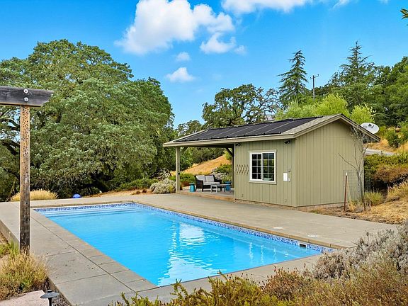Welcome to 31000 Pine Mountain Road, a truly exceptional estate perched on over 11 private acres just five minutes from inviting downtown Cloverdale. This elegant single-story home offers panoramic views overlooking Cloverdale, Alexander Valley and beyond from nearly every room, with a seamless indoor/outdoor layout that blends luxury and nature. The chef's kitchen is a dream, complete with granite counters, a spacious island, walk-in pantry, Viking appliances, and multiple sinks, including a wet bar. The expansive great room features a wood-burning fireplace and opens onto a large south-facing deck, ideal for entertaining or simply soaking in the breathtaking surroundings. Outside, enjoy resort-style amenities including a heated pool, cabana room complete with sink, refrigerator, power, covered patio, private outdoor shower, and lighted bocce court under the shade of majestic oak trees. The property includes both PG&E and an owned solar system, offering the best of energy efficiency and reliability. For the hobbyist or equestrian, there's an impressive 2,800 sq ft building perfect for a workshop or storage, plus a 100+ year old barn and ample space for horses or farm animals. This is Sonoma County Wine Country living at its finest ~ spacious and graceful.