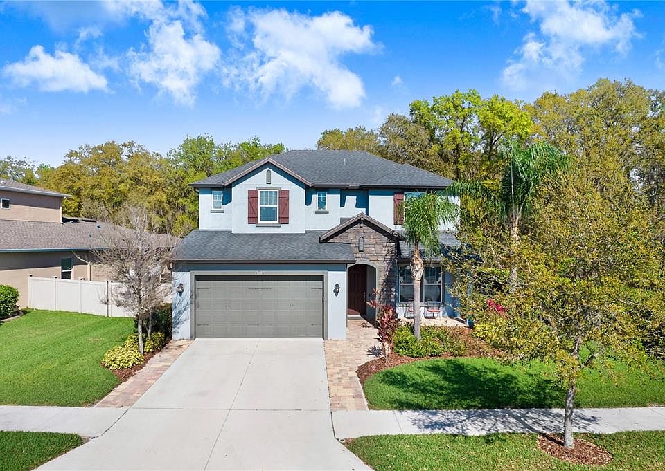 Check out this gorgeous home in the very desirable Provence community in Meadow Pointe IV! This one-of-a-kind home sits on a premium lot which backs up to a quaint majestic protected oak tree park right in your back yard! No neighbors to the right and back of this home! When entering this home, you are immediately greeted by gorgeous wood grain porcelain tile that runs throughout the formal dining room, kitchen & great room. After walking through the entrance to the open kitchen/living room you will be delighted to see the relaxing Oak Tree Park right out back! The spacious gourmet kitchen features granite countertops, plentiful storage with 48"cabinets, walk-in pantry, double oven, stainless steel appliances & overlooks the great room. First Floor Master Bedroom , No carpet on first floor with the 3 remaining/Bonus bedrooms upstairs with brand new carpet starting at the stairs. When you go out the back you'll find a nice sized fenced in back yard and you'll find a nice screened in lanai that you could relax sit and relax and enjoy your oak tree park view every morning! The large game room/bonus room area upstairs panoramic windows that overlook the scenic oak park & can serve as a media room, fitness area, game room, home office or 5th bedroom! This is a special one-of-a-kind home with tasteful finishes all through out and located in a very desirable area with a community that it all like tennis courts, playground, pool club house and more. Conveniently located near I-75, SR 54, minutes away from schools, restaurants & shopping. Schedule a tour today and see for yourself!