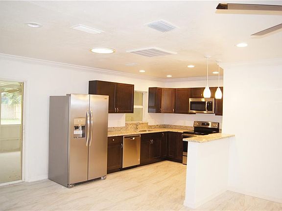 MOVE IN READY, PRICED TO SELL. This total renovation includes a brand new kitchen, new bathrooms, an additional bedroom, New Porcelain Tile throughout, new paint, new On-Demand water heater, new paint, crown moldings, Granite Counters and real wood Cabinets in Kitchen, New Stainless Steel Appliances, new fixtures and much, much more. The property is close to 1/4 Acre and features a big fenced backyard with room for a pool with space to spare. The driveway is extra wide and there is a very large covered and screened lanai as well as a screened porch. You will fall in love with this lovely, like a new home as soon as you see it. The home is now 1186sqft with the addition of a bedroom with a half bath. Now a 3br/1.5ba with eat-in kitchen, breakfast bar, living room, 1 car garage with automatic opener and new rocker style light switches throughout.