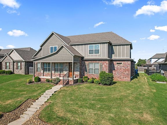 This 4BD/2.5BA home has it all: space, thoughtful design & a prime location! The living room, with vaulted ceilings opening to an upstairs balcony, welcomes you to the open-concept main level & includes a gas fireplace. The eat-in kitchen features granite countertops, counter seating, SS appliances, a large island, walk-in pantry & spacious dining area. The main-level primary suite offers a generous ensuite with 2 vanities, a fully tiled walk-in shower, whirlpool tub & oversized walk-in closet. Upstairs, you’ll find 3 bedrooms, a full bath w/ dual vanity & a bonus room perfect as a playroom, office or 5th bedroom. The laundry/mud room, just off the kitchen, features built-ins & leads to the 3-car garage The fully fenced backyard includes a covered patio for outdoor entertaining & an exterior storage closet while the covered front porch overlooks beautiful landscaping and foliage across the street. Don’t miss your chance to own just minutes from Downtown Bentonville, the new Home Office Campus, I-49 & NWA trails!