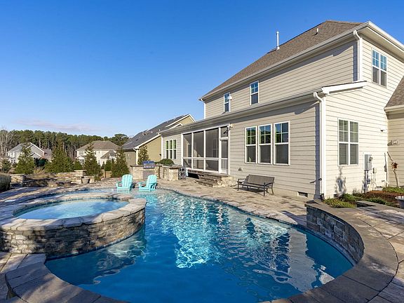 Live in Luxury in the Heart of Apex! Spacious 3,384 sqft. 4BR/3.5BA home with 3 car garage. Gourmet chef's kitchen w/stunning granite tops, wall ovens & gas range top. First floor owner's suite with walk-in closet & spa bath. Large bonus room & walk in storage area. Bedroom 2 upstairs has private full bath. Entertain in style at the saltwater pool, outdoor fire pit & grill areas, or relax on the private screened porch. Landscape lighting and fenced rear yard with garden areas. Make this one yours today!