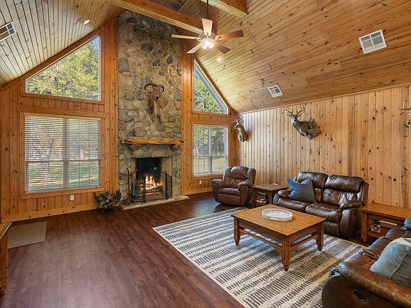 Wood-burning stone fireplaceWrap-around porchNew fansBrand new flooringVaulted ceilingFully stocked pondOpen-concept dining and kitchen