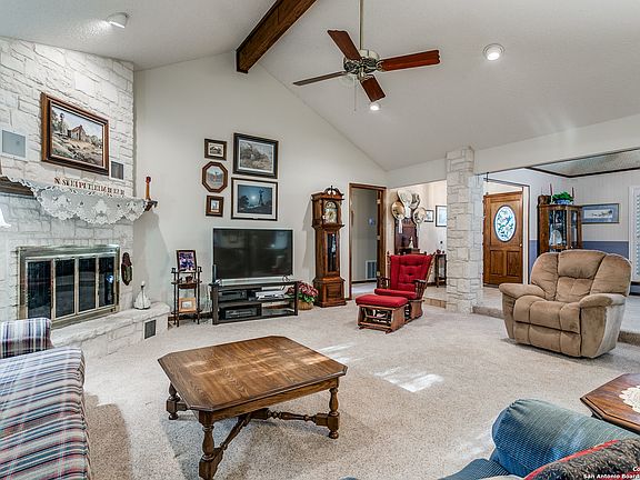 Nestled on a picturesque corner lot with winding mature oak trees, this classic stone one-story offers timeless curb appeal and peaceful surroundings. Featuring 3 bedrooms, 2 baths, plus a dedicated office, the home boasts a thoughtful split bedroom floor plan for privacy and functionality. This home has been lovingly maintained with newer HVAC units, windows, tile, carpet, cooktop, and water softener. The spacious living area showcases a vaulted ceiling and a beautiful stone fireplace. A large kitchen with island provides abundant cabinet storage and plenty of workspace, while the beautiful 330 sq ft atrium offers the perfect spot to relax and take in views of nature. Additional highlights include a 420 ft well for watering the yard and an epoxy-coated garage floor. Homes like this rarely come available in Oak Village North - don't miss your chance to make it yours.
