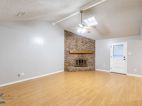 Situated on a quiet dead end street, this well cared for brick home offers a comfortable and practical layout with 3 bedrooms, 2 bathrooms, and a 2-car garage. Inside, the living room features laminate wood flooring, vaulted ceilings, and a brick fireplace, creating a warm and open space to gather. The kitchen and laundry area include tile flooring for easy maintenance and everyday use. The eat-in kitchen provides space for casual dining, and appliances will convey with the property. The large laundry room offers additional square footage that could serve as a small office, hobby space, or extra storage. The primary suite includes a large vanity, two closets, a walk-in shower, and a linen cabinet for added convenience. You’ll find carpet in the bedrooms and hallway, LVP flooring in the secondary bath, and fresh touch up paint throughout. Outside, enjoy the covered back patio, a storage building with electricity and double doors, and a well maintained yard that’s easy to care for and ready to enjoy. This home blends comfort, function, and thoughtful updates in a peaceful Abilene setting.