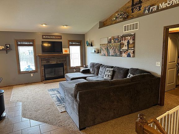 Move in ready home featuring 4 bedrooms, 3 bathrooms, and an open concept with cathedral ceilings. The main level features open-concept kitchen, dining, and living room with a wood-burning fireplace. The kitchen has an island sink and breakfast bar with all appliances remaining. The large primary suite has walk-in closet, an attached bathroom with dual vanity and large shower. There are two secondary bedrooms, full bathroom, and laundry room that rounds out the main level. The finished basement has a spacious family room, a extra-large 4th bedroom with egress window, a bonus room, bar area, and 3rd bathroom. Call or text Jon to set up a showing 620.253.1652.