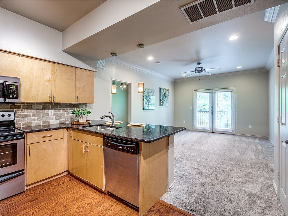 Charming and contemporary 2 bedrooms, 2 baths condo in the heart of Oak Lawn is ready to move-in! Located in a secured-access complex, there is a gated underground garage with 2 reserved parking spaces next to each other. The home is located on the second floor, overlooking greenery and trees. Enter the home to an open and functional kitchen with granite countertops, eat-in breakfast bar and stainless steel appliances. Entertain in the spacious living room with lots of natural light and double doors opening to a step out balcony. Either side of the living room is a bedroom with an ensuite full bath and walk-in closets. Community amenities include a large open courtyard, gym and pool, and on-site management during M-F. Quick access to Tollway, highway 35, lots of shopping, restaurants, Medical District and hospitals, nightlife, Katy Trail and more.