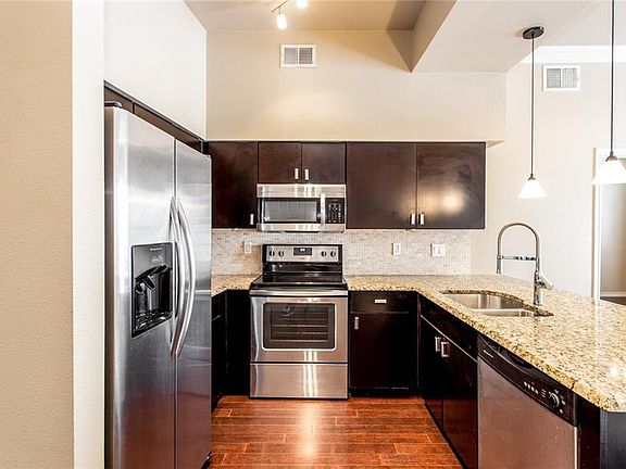 Located minutes from downtown Dallas, enjoy an easy commute from an updated condo with 2 deeded parking spots with direct elevator access from the garage - No Stairs! Hardwoods greet in the foyer entrance that opens to a large kitchen complete with granite counters, stainless steel appliances, tile back splash, & pendant lighting. A breakfast bar overlooks a sunny family room where you can open the door and step onto the courtyard patio for easy entertaining! Enjoy cookouts & gatherings while being close to home. Back inside, a split bedroom plan offers privacy with updated ensuite tile baths in both bedrooms, one with a jetted tub for relaxing, as well as custom closet storage!
