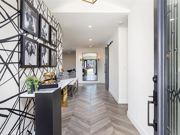 stone, open shelving, surround sound and backyard access. The dining room displays a barn door that