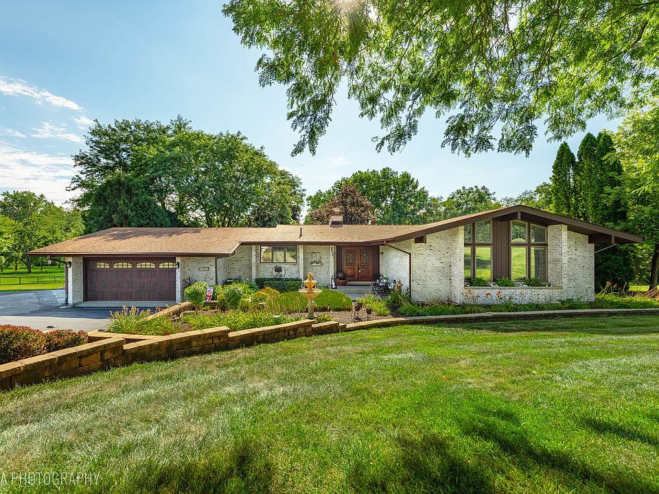 Motivated Sellers! Discover the perfect blend of shabby chic farmhouse charm and modern convenience with this stunning 5-bedroom, 3-bath walkout ranch on 2.05 acres. As you step inside through the custom barn doors, you'll note this thoughtfully crafted home offers rustic elegance with all the comforts of contemporary living. The kitchen features vaulted ceilings, engineered hardwood flooring, granite counters and top of the line Wolf and Miele appliances, an island with breakfast bar and an adjacent dining room with a see-through fireplace. You will love the plantation shutters on the wall of windows spanning the living and dining rooms. Down the hall is a gorgeous primary suite with a new bath boasting heated floors and towel bar, two vanities, separate water closet, spacious walk-in closet, laundry and private deck. Two secondary bedrooms and a renovated hall bath complete the main level. In the walkout basement, you will find a cozy family room with a second fireplace, two additional spacious bedrooms, another full bath and an office/exercise room. Step outside to your own private backyard paradise - complete with a semi-inground heated pool, a serene pond, and a classic chicken coop that adds timeless country character. Take in the views and beautiful landscape from the various seating areas on the patio or decks, around the firepit or at the outdoor bar. There's also an invisible fence for your pets! Plenty of storage exists in the 2.5 car garage with epoxy flooring, workbench and walk up attic space, the shed and the convenient room off the back of the house. Whether you're entertaining guests, enjoying peaceful evenings in the pool, or savoring the space to spread out, this home offers the best of both worlds: a quiet, rural feel adjacent to large horse properties just minutes from downtown Crystal Lake and highly sought after Prairie Ridge High School. A true gem for those who crave space, style, and privacy!