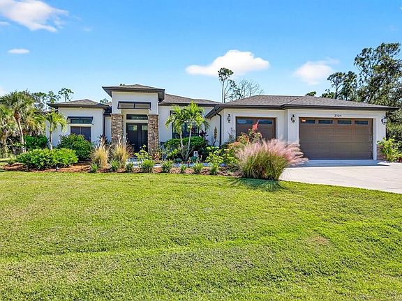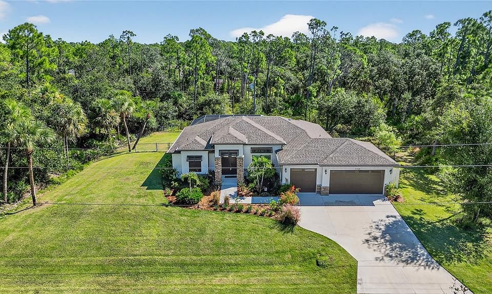 Beautifully situated on almost a half acre PLUS the seller owns the two lots behind that can be sold for a total of just under 1 acre! A 3-CAR garage, 3 full bedroom plus an OFFICE/DEN, all tile plank floors, IMPACT windows, and Bahama shutters make this open floor plan home sensational. Privacy surrounds the heated, saltwater swimming pool surrounded by paver sun decks, inside and beyond the screen enclosure. Rain Bird irrigation on the lawn of golf course quality grass and drip irrigation on the plantings enhance the beauty of the fenced yard. The 3-car garage has a lift for storage, epoxy coating, and 3 built-in tall cabinets. Inside this custom home built in 2020, additional features are a whole-house R/O system, wide plantation blinds, roll-down sun shades, soft-close tall cabinets, granite counter tops, crown molding, convection oven & cook top, marble window sills, a tray ceiling in the living room, ceiling fans, and walk-in closets in all 3 bedrooms. Quality doors and lighting evoke a charming coastal appeal. Guests have privacy and access to the pool from the hall bath. Have peace of mind with impact windows, an alarm system, Tuaex in-wall pest guard system, 6" gutters all around the house, underground power wires, and a multi-speed pool motor on a timer to save energy. The a surge protector for the whole house also includes the well, pool, breaker box, and wiring for a generator plug on a side patio. Added within the past year: lanai fans, salt cell for pool, pool pump motor, pool light, well pump, and Traex in-wall pest control. NO HOA! So private and quiet, yet so close to shopping, dining, medical, boating, golf, and entertainment. Don't miss the opportunity to have almost 1 acre in Southwest Florida--with a beautiful house quality built in 2020!