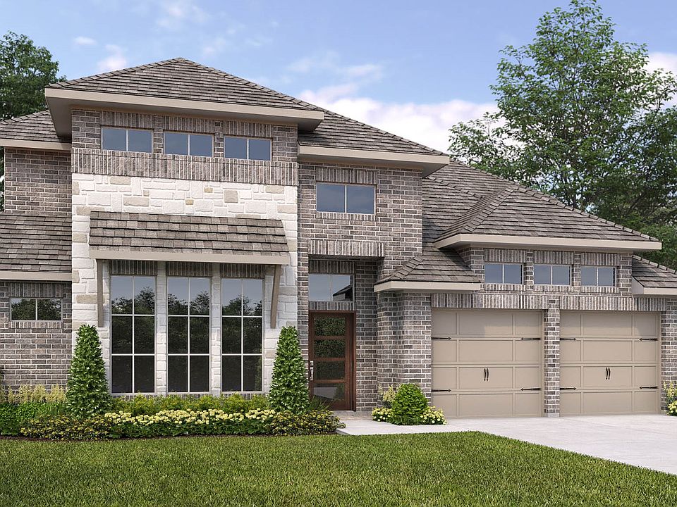 Home office with French doors set at two-story entry. Formal dining room across from staircase. Two-story family room opens to kitchen and morning area. Family room features a wood mantel fireplace and wall of windows. Kitchen features deep walk-in pantry, butler's pantry, a 5-burner gas cooktop and large island with built-in seating space. First-floor primary suite includes bedroom with wall of windows. Double doors lead to primary bath with dual vanities, garden tub, separate glass-enclosed shower and two walk-in closets. An additional bedroom is downstairs. A game room, media room and secondary bedrooms are upstairs. Covered backyard patio. Mud room off three-car garage.