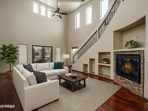 Discover comfort and space in this beautifully designed two-story home offering 2,604 square feet of well-appointed living. The primary suite is conveniently located on the main level, providing easy access. Step into the formal living room, where soaring vaulted ceilings, clerestory windows, engineered wood floors, and a cozy gas fireplace create a bright and inviting space perfect for relaxing or entertaining. A grand staircase with wrought iron railing leads you upstairs to a versatile loft, three additional bedrooms, a full bathroom, and a laundry room. Step out onto the upstairs deck to take in stunning sunsets, city lights, and breathtaking views of the Organ Mountains. The kitchen and bathrooms feature elegant granite countertops, and the home is thoughtfully upgraded with insulation between common walls and floors, pre-plumbing for a central vacuum system, and pre-wiring for surround sound with volume controls. Enjoy added comfort and efficiency with refrigerated air, low-e windows and so much more.