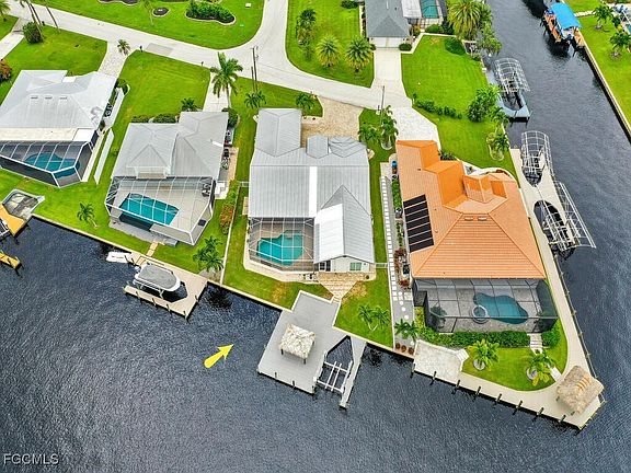 Explore this Beautiful, Gulf Access, Pool Home located in SE Cape's Cornwallis Neigborhood. This Stunning 4 Bedroom, 3 Bath Waterfront Oasis is just mins from the River & offers Fantastic Boating Access! Boasting over 2880+ Sq Ft of Living Space, this is the Perfect Home for Large Families and Visiting Guest. Soaring Ceilings greet you upon entering the home, there's a Spacious Living Room with Formal Dining Area. The Smart Kitchen Design offers a Prepping Island, SS Appliances, Ample Cabinet Space & Solid Surface Counter-Tops. Impact Sliders open to the Covered Lanai & Pool Area from most every room! Just off the Living Room is a Large Family Room that can serve Multiple Uses. The Primary Suite also offers access to the outdoor space while still providing privacy from the rest of the home. 3 additional Guest Bedrooms & 2 Full Baths Complete the Space. The Screened-In Pool Area is surrounded by Brick Pavers, providing ample Covered Space for Outdoor Dining & Entertaining. Boaters will Love the Enourmous Dock with Captains Walk, Boat Lift & Tiki Hut! Only Mins to the River, No Bridges or other Restrictions. Other Notable Features worth mentioning include New AC 2020', Durable Metal Roof, Brick Paver Driveway, 3-Car Garage, Fresh Exterior/Interior Paint, Impact Doors & Windows, NO PAST FLOODING, & Transferable Flood Policy!! Don't wait to see this home, it's priced to Sell Fast, so call your Agent Today!