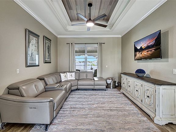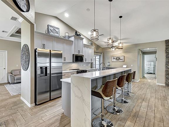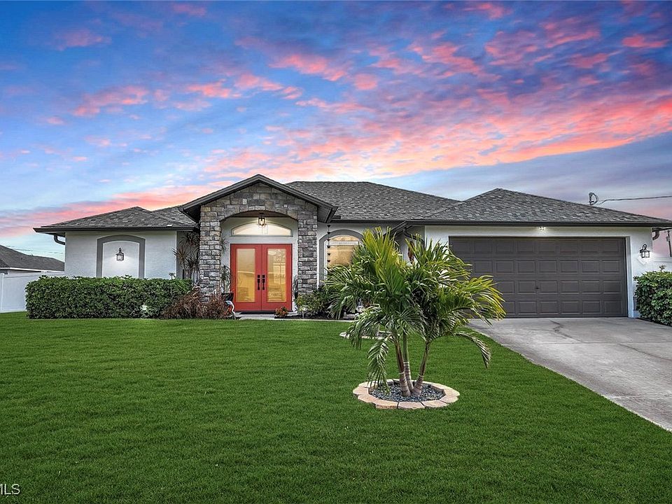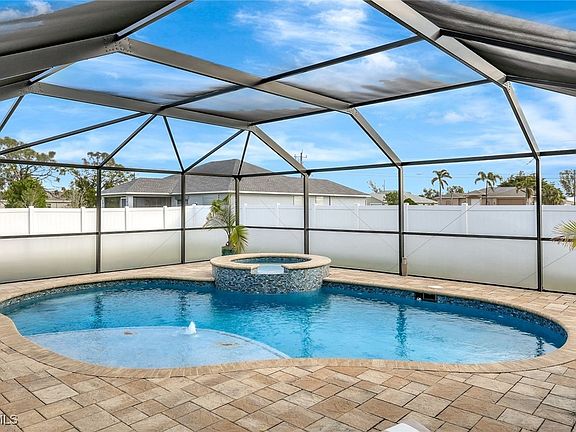 POOL HOME, IMPACT PROTECTION, LOADED w/STYLISH UPGRADES! Discover the ultimate Florida retreat, perfectly situated on a spacious triple lot in the heart of SWFL. Home features 3 BR, 2 BA and 2 car GAR with just under 2200 sqft of living space. Step inside through the stacked stone accents and double front doors, where you’ll find high ceilings with decorative wood tongue and groove tray ceiling designs and features throughout, creating a warm and sophisticated atmosphere. Wood plank tile flooring spans the home, complemented by crown molding and decorative niches with stacked stone inlays. The heart of the home, the kitchen, was completely remodeled in 2024. It showcases quartz countertops with a matching backsplash, a large sink, and sleek stainless steel appliances. The open-concept design includes both a family room and living room, each with direct access to the pool area. The spacious primary suite is a serene retreat, offering two walk-in closets, private access to the pool, and a spa-like en-suite bathroom. The bathroom features a jacuzzi tub, a walk-in shower, dual sinks with quartz countertops, and extra storage space. The outdoor living space is a true showstopper. The outdoor oasis features a heated salt water pool and spa, installed in 2023, complete with a sunshelf adorned with charming blue crab mosaics and a relaxing water bubbler feature. Surrounding the property is a newly installed 6-foot privacy fence (2023), providing seclusion and tranquility. IMPORTANT UPGRADES: Generator ready with buried 500-gallon propane tank and electrical transfer switch in place, NEW 4-ton A/C unit with updated ductwork (2024), pre-wired for electric shutters and an Entek whole-home water filtration system. The lanai features pavers and a custom shiplap wood ceiling. A separate pavered grilling deck completes the backyard, providing a perfect setting for gatherings or quiet evenings under the stars. With a new shingle roof and impact windows and doors (2024), as well as fresh exterior and interior paint (2025), this home is as functional as it is beautiful and is move in ready. Located in a sought-after area, this gem offers a unique opportunity to enjoy the Florida lifestyle at its finest, just minutes away from all the conveniences and coastal charm Cape Coral has to offer: outdoor activities, good food, temperate weather year round, boating, kayaking, jet skiing, world class fishing & white sandy beaches at your fingertips! Located in Flood Zone X!